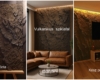 Vulkanikus hatású kézzel formált sziklafal modern nappaliban, beépített médiafallal Vulkanikus hatású kézzel formált sziklafal modern nappaliban, beépített médiafallal